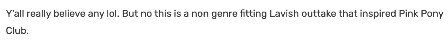After Lavish was released Roan sought out to change her musical style, as she stated she disliked the album and School Nights. Roan got inspired by "Are You With Me?" and recorded her song "Pink Pony Club", which would lead to her creating her second studio album, The Rise and Fall of a Midwest Princess.[1]